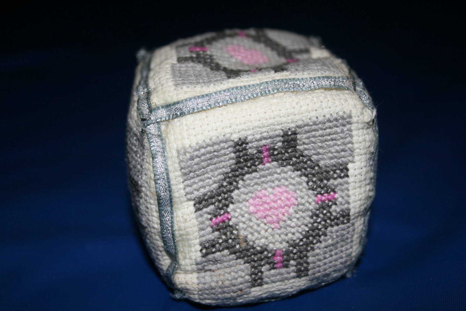 I pretty much followed the directions from bellastitch, which were brilliant, with photos at each stage. I weighted my companion cube with decoration sand, so it has quite a nice weight to it. Although the cross stitch itself was simple, it requires a lot of patience, due to the fact that it needs to be repeated so many times. After sewing each of the individual cube faces, I attached fusible interfacing to make sure that it held it's cube shape. The most difficult bit by far was trying to sew it all together and keep it somewhat cube shaped. Unfortunately my stitching left a lot to be desired so I headed off to my local habidashery the day before our wedding anniversary and got some silver ribbon and fabric glue and finished it off just in time.